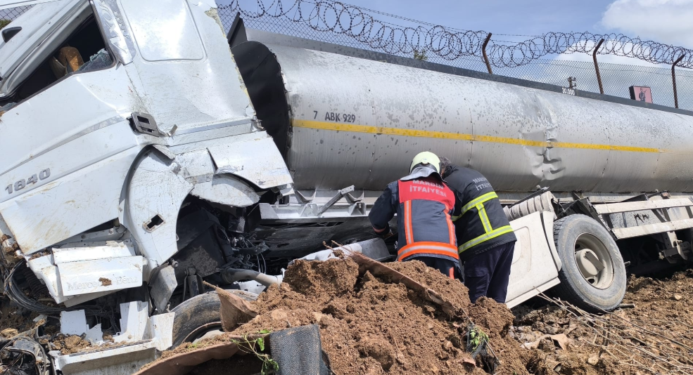 Mardin’in Nusaybin ilçesinde seyir halindeyken kontrolden çıkan yakıt tankeri yol kenarındaki duvara çarptı.